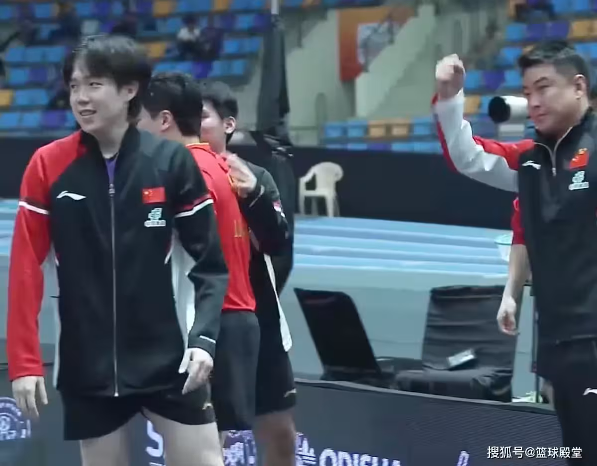 後續林詩棟也在拍梁靖崑的身體。其實林詩棟也是一個關鍵人物,第三盤他頂住壓力,這才有了後續王楚欽和梁靖崑連下兩盤,他們都展現了男團的凝聚力。