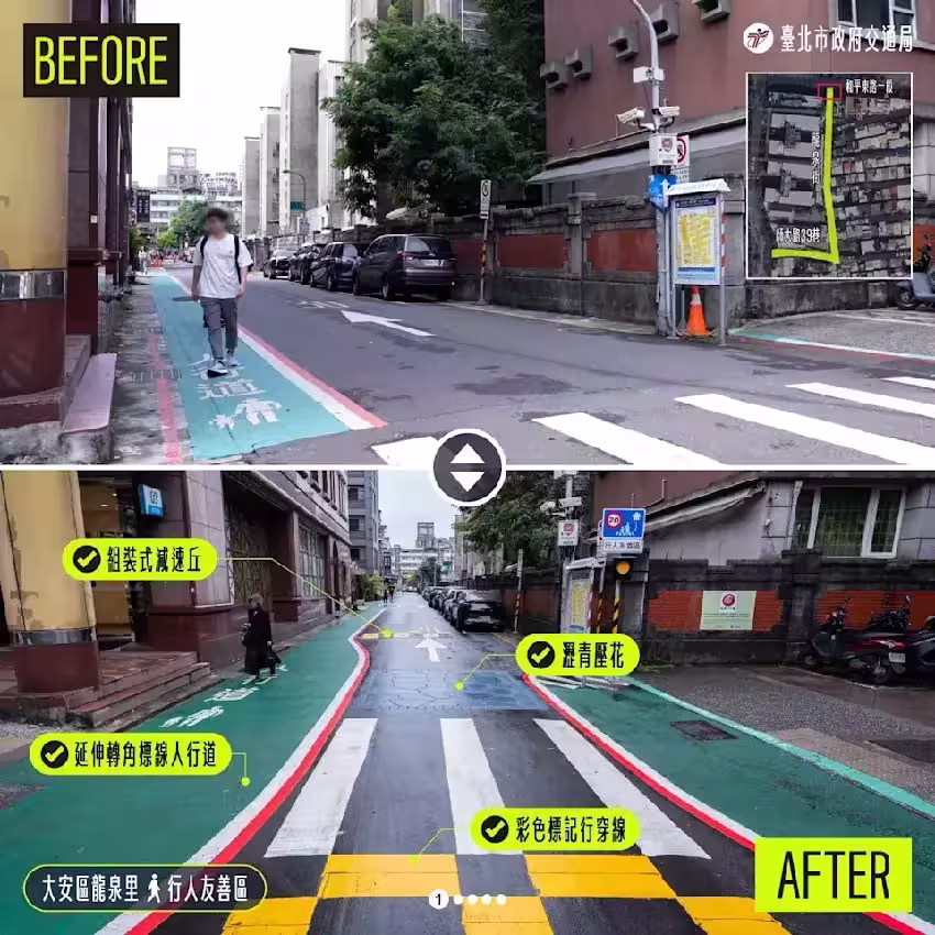 台北市交通局說明,未來將逐步推廣至行人密集路段,搭配行穿線與減速區段,營造更安全、舒適的步行環境。