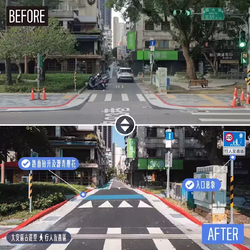 不過駕駛千萬別以為這只是「裝飾用」,根據規定,行人友善區車輛限速不得超過30公里、行人優先區更不得超過20公里,且禁止按喇叭驅趕。