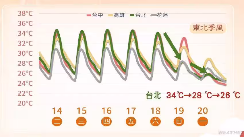 至於近期天氣變化,中央氣象署指出,下周日(19日)至下周二(21日)東北季風增強及熱帶性低氣壓或颱風外圍環流影響,基隆北海岸、東半部、恆春半島和大台北山區有陣雨,並有局部大雨或豪雨發生的機率,北部跟中南部山區有短暫陣雨,並有局部大雨發生的機率,其他地區也有局部短暫陣雨。