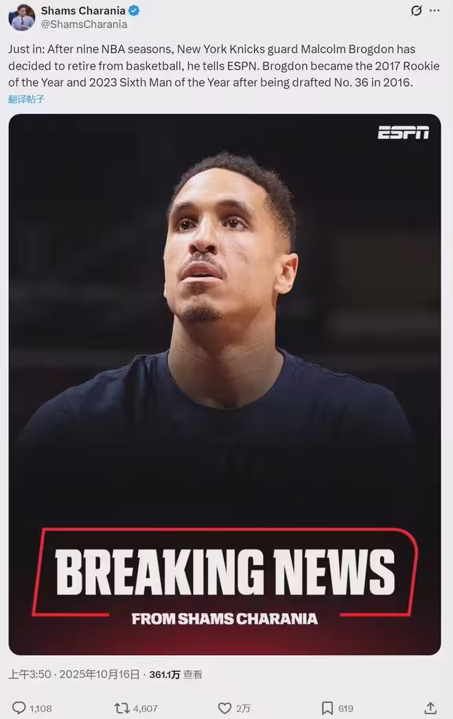 10月16日凌晨,據NBA名記Shams報道,馬爾科姆-布羅格登正式宣布退役,結束九年NBA生涯。今年休賽期,布羅格登和尼克斯簽下一份訓練營合同,他原本有機會轉正。但今天布羅格登突然告訴尼克斯,自己決定退役。