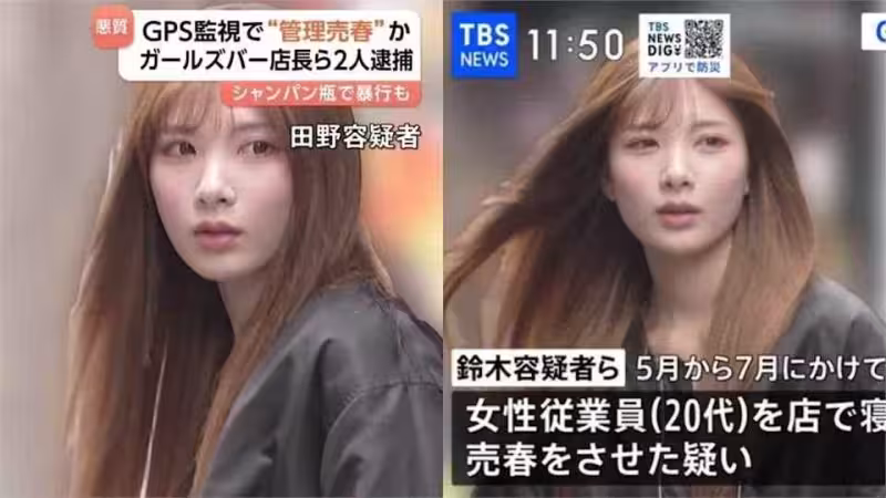 日本東京一間「女孩酒吧」店長分別是39歲鈴木麻央耶和21歲田野和彩,近日被爆出女員工遭店長以暴力脅迫賣淫,甚至還將女員工軟禁,利用GPS監控行蹤,短短3個月內接客數高達400人,不法獲利達600萬日圓(約新台幣126萬),