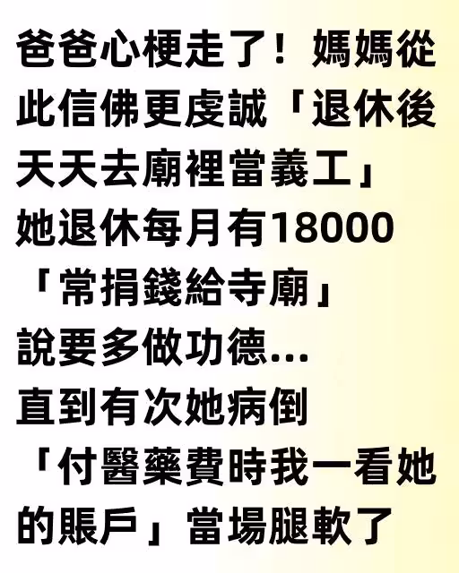 爸爸心梗走了!媽媽從此信佛更虔誠「退休後天天去廟裡當義工」,她退休每月有18000「常捐錢給寺廟」說要多做功德… 直到有次她病倒「付醫藥費時我一看她的帳戶」當場腿軟