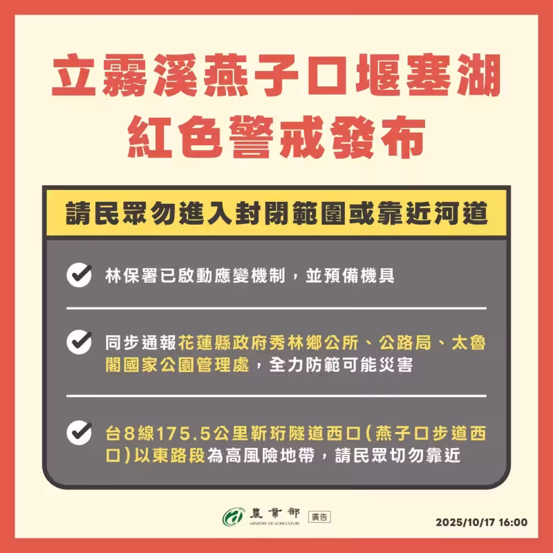 有PTT網友翻出過往燕子口未崩塌前的水位狀態,與17日花蓮分署公開的堰塞湖照片相比,形成震撼落差。從影像可見,水位已與路面齊平,甚至部分溢流至道路。不過花蓮分署表示,今晨2點半太魯閣新堰塞湖雖已溢流至靳珩隧道東口,但湖水經魯丹橋後又回流至立霧溪主河道,目前整體流勢暫時平穩、對下游風險降低,不過依舊沒有解除危機,相關單位已委託成功大學團隊進行評估,並會同廠商以怪手開挖便道、嘗試往上游挖除壩體引流,儘快順利拆彈。