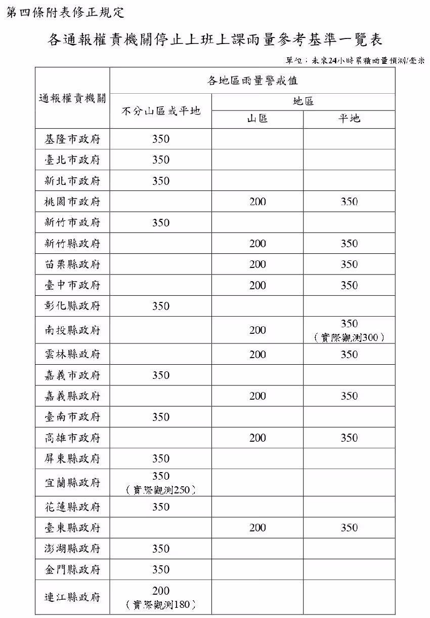 依《天然災害停止上班及上課作業辦法》規定,「水災」類停班停課標準為:未來24小時累積雨量預測達山區200毫米、平地350毫米 (部分縣市山區與平地同為350毫米) ,且已造成災情或有致災之虞時;若因降雨導致河川水位暴漲、橋樑中斷、道路積水、地形變化產生危險,影響通行及上班上課安全,地方政府也可據此發布停班停課。