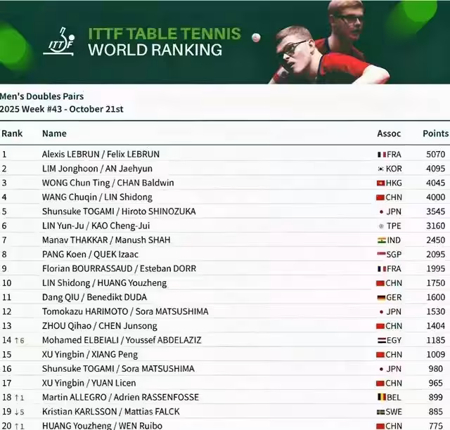 國乒方面,男雙世排最高的是王楚欽/林詩棟,雙頭組合目前排在第4位。國乒的男雙建設,還未達到比較理想的程度。