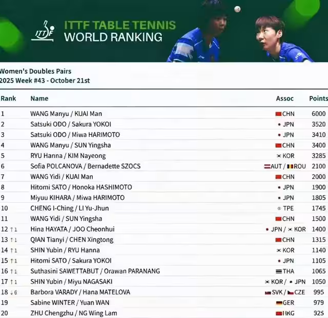 女雙戰線,國乒雙曼組合王曼昱/蒯曼,憑藉今年多站大賽的奪冠佳績,翱翔於九霄雲外,目前已經成為高不可攀的榜首。