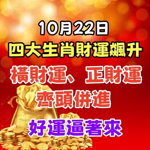 時間如流水般飛逝,而在這個特別的10月22日,有四大生肖即將迎來屬於他們的幸運時刻。 這一天,四大生肖財運飆升,橫財運、正財運齊頭並進,意外的好運也會接踵而至,好運勢不可擋。 這四個生肖無論是在工作、事業,還是生活中,都將獲得一波巨大的好運,財源滾滾,人生達到新的高度。 那麽,這四個生肖究竟是誰呢? 我們來深入探討一下他們的幸運軌跡以及財富提升的機會和建議。