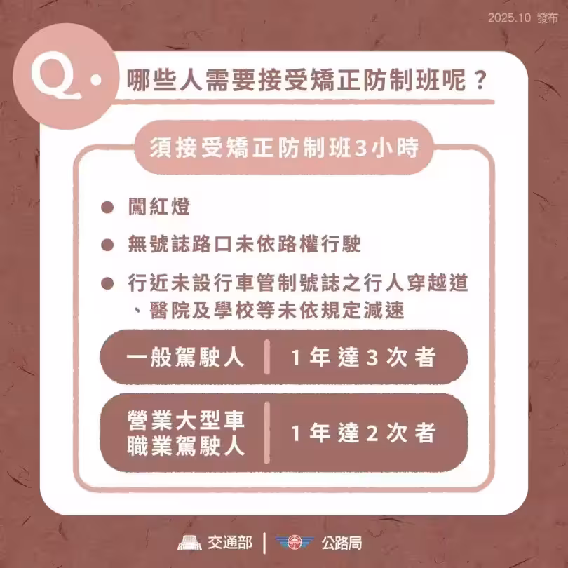 交通部強調,一般駕駛人犯上述3項特定違規1年達3次者、營業大型車職業駕駛人1年達2次者,納入矯正講習對象,必須上3小時矯正防制班,即時矯正錯誤駕駛觀念,呼籲用路人遵守交通規則。