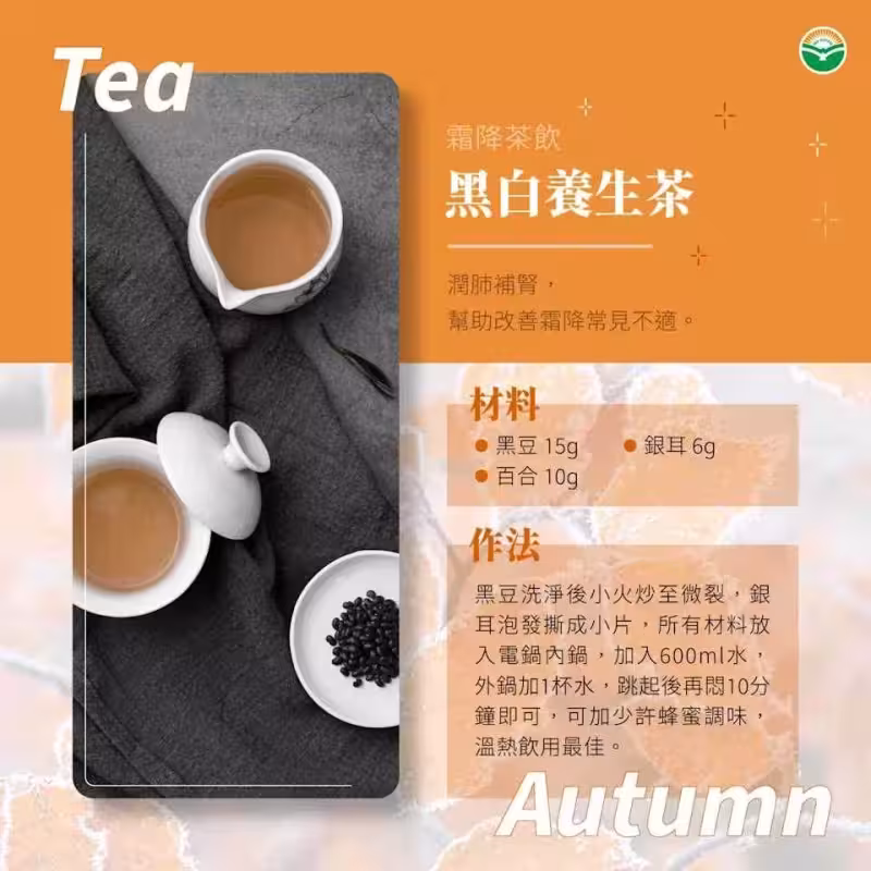 鍾典育醫師還推薦一款適合霜降節氣的黑白養生茶,材料包括黑豆15克、百合10克及銀耳6克。做法是先將黑豆洗凈後用小火炒至微裂、香氣溢出;銀耳泡發後撕成小片;再將所有材料放入電鍋內鍋,加水600毫升,外鍋加1杯水煮熟,跳起後再悶10分鐘。最後可加少許蜂蜜調味,溫熱飲用效果最佳。