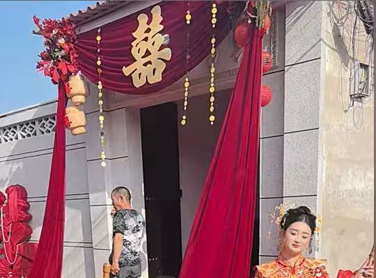 燈籠街的門頭上面寫著愛女和賢婿,據當地網友稱新郎和新娘是同一個村的,兩家離得特別近,村裡的這些布景是兩家一起辦的。