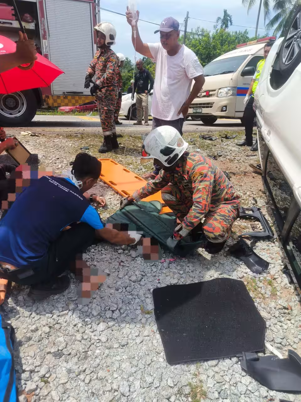 「消拯員於下午1時40分左右抵達現場,並使用特殊工具將傷者移出車外,之後給予初步治療。」