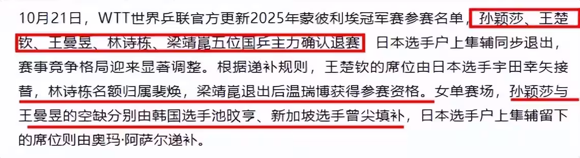 退了的位置總不能空著,得按規矩找人補,王楚欽的名額給了日本的宇田幸矢,林詩棟那邊補上來的是裴煥,梁靖崑的位置歸了溫瑞博。