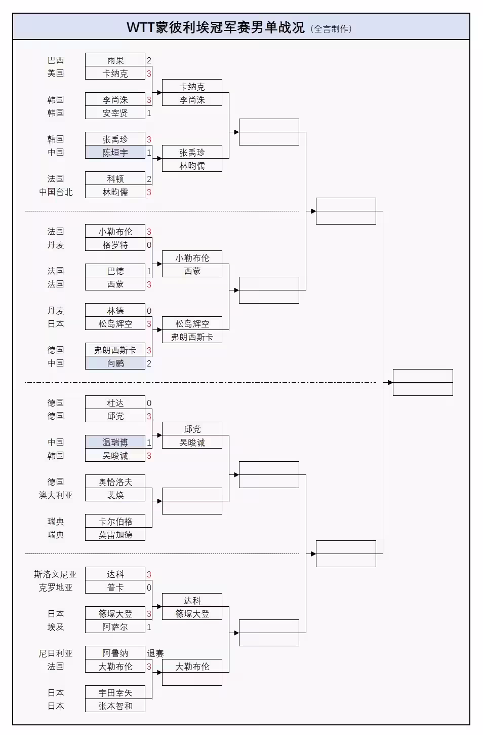 本站比賽冷門迭出,首輪比賽還沒打完,男單前八種子就已經有3人被淘汰,分別是一號雨果輸卡納克、五號杜達輸邱黨、六號向鵬輸弗朗西斯卡;女單前八種子更是有4人一輪游,包括一號陳幸同輸斯佐科斯、二號蒯曼輸金娜英、七號伊藤美誠輸薩馬拉、八號大藤沙月輸曾尖。