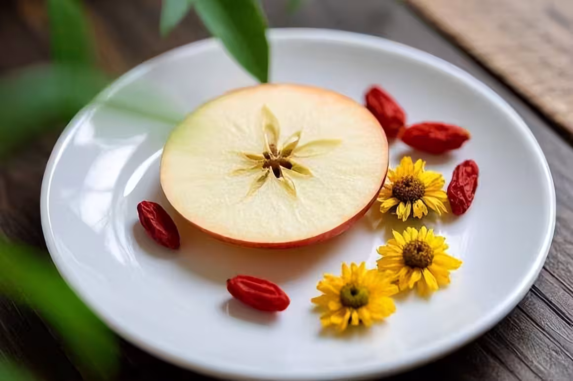 菊花 性甘、苦,有 疏散風熱、明目、清熱解毒、平肝陽 之功。 枸杞 的功效大家應該都不陌生, 滋補肝腎、明目、潤肺 。其所含有的枸杞多糖、類胡蘿卜素、維生素C等,也能滋養肝血、明目。他們和蘋果搭配在一起,能夠把蘊結在肝臟上的火氣一舉殲滅,清熱解毒、明目。