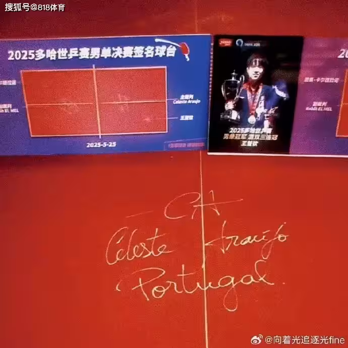 王楚欽奪冠後,他和雨果,還有擔任值裁工作的兩名裁判,都在球檯上簽名留念。
