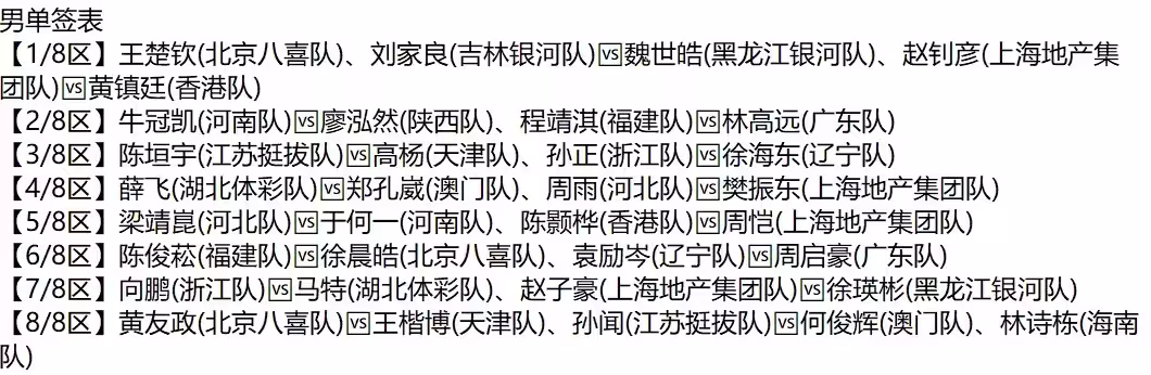 樊振東位於4/8區,首輪即迎來硬仗,對陣河北隊老將周雨。周雨直播時調侃與樊振東高端局,他直言當時我們打國際的公開賽的時候,也隨機抽籤經常碰到小胖,這是我第五屆全運會,非常珍惜這樣的機會!