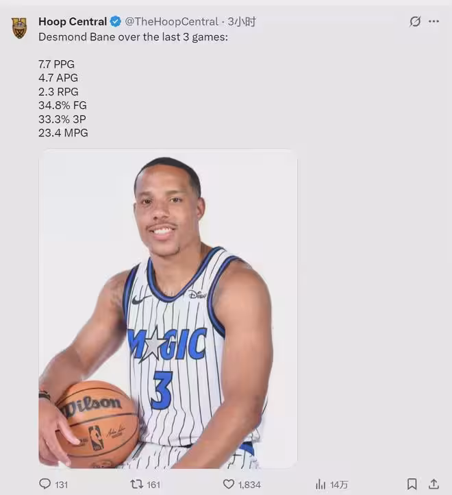 11月7日,NBA媒體Hoop Central曬出一組數據:最近三場比賽,魔術後衛貝恩場均7.7分2.3籃板4.7助攻,投籃命中率僅有34.8%,三分命中率33.3%。目前魔術3勝5負,僅排名東部第11位,戰績跟黃蜂持平。