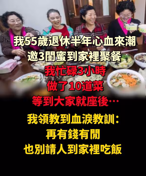 我55歲退休半年, 心血來潮邀3閨蜜到家裡聚餐,我忙碌3小時、做了10道菜,等到大家就座後…我領教到血淚教訓:再有錢有閒,也別請人到家裡吃飯~