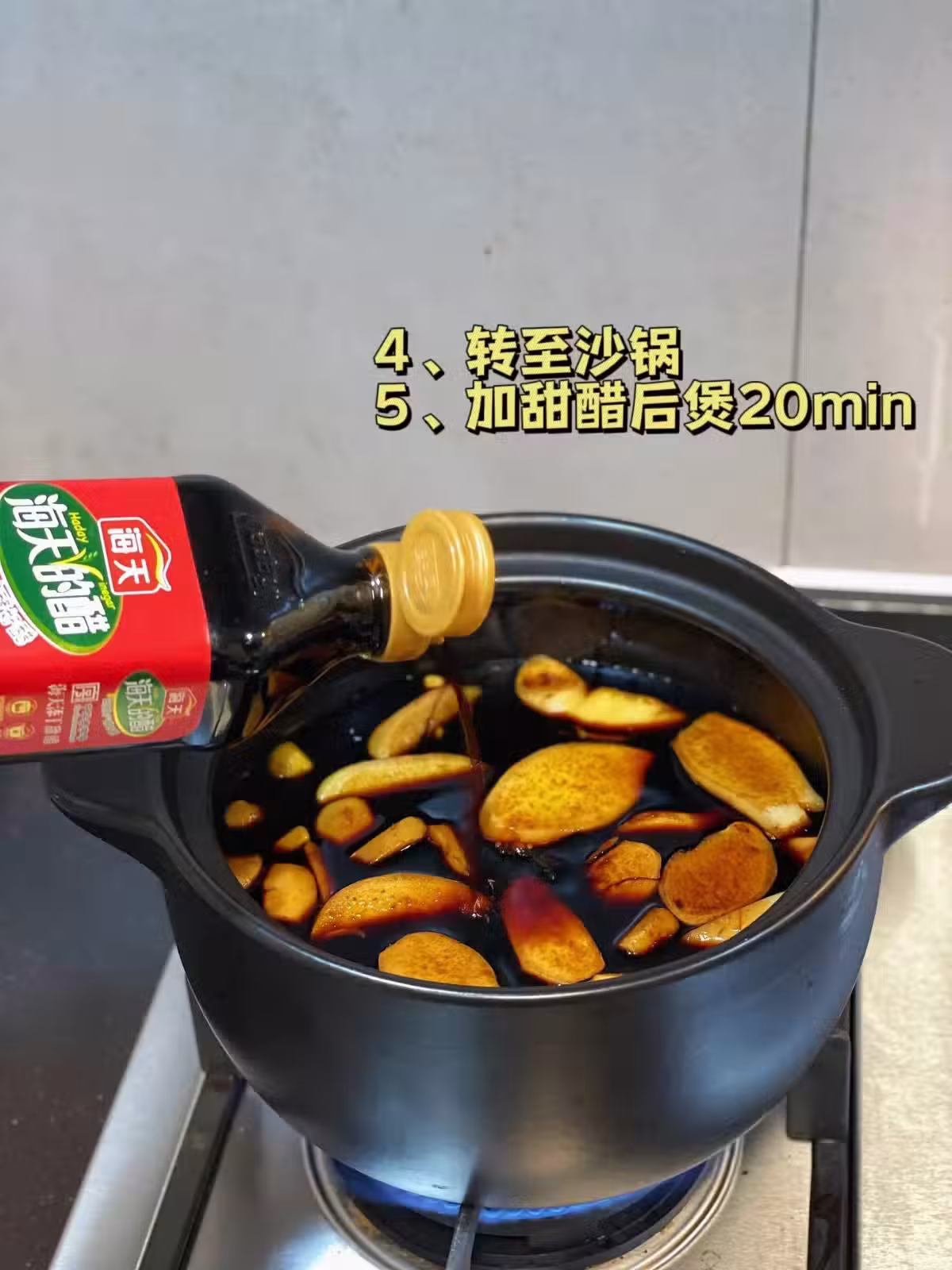 2、豬腳/豬手加白醋焯水,過冷水洗凈,瀝干後下熱鍋炒至微焦,中途加一匙鹽,轉至沙鍋,大火煲滾,轉中小火繼續煲1小時