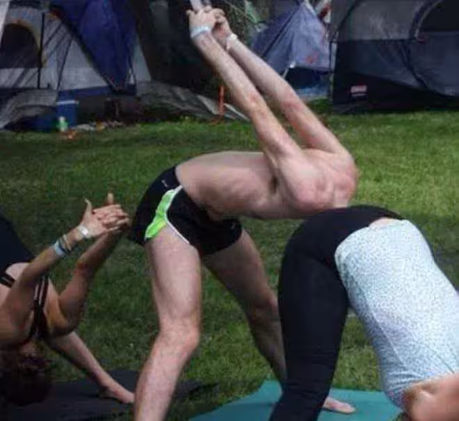 一群人正在做健身運動,其中第二位男士頭部的位置經過錯位的拍照,有些讓人難以描述。