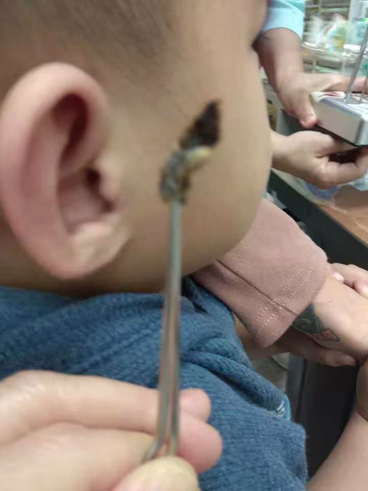 媽媽檢查發現耳洞口堵著大塊耳屎,於是上演全家總動員:用棉簽嘗試未果,孩子緊張得直嚎,最終爸爸用鑷子成功夾出。