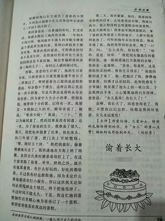 我把蛋糕藏在衣服底下,當爸爸看到蛋糕時,他的眼淚流了下來,一把抱住了她,靜靜地看著她,「此刻我感覺十分幸福!」她小心翼翼地拔掉爸爸頭上的一根白髮,爸爸說,「女兒真乖,你長大了。