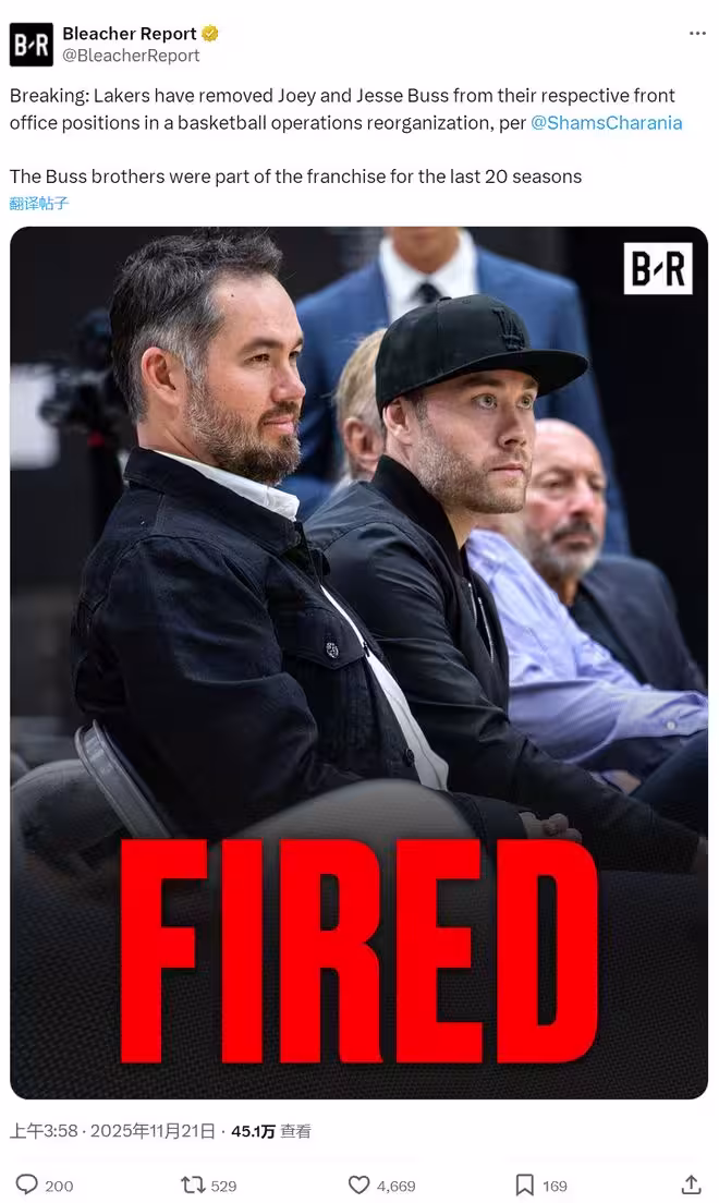 11月21日,據NBA名記Shams報道,湖人管理層發生重大變動,立即解除兩個小老闆喬伊-巴斯和傑西-巴斯在管理層的職務。儘管將大部分球隊股份賣給馬克-沃爾特,但巴斯家族仍然保留了15%的股份,這哥倆依然是湖人小股東。