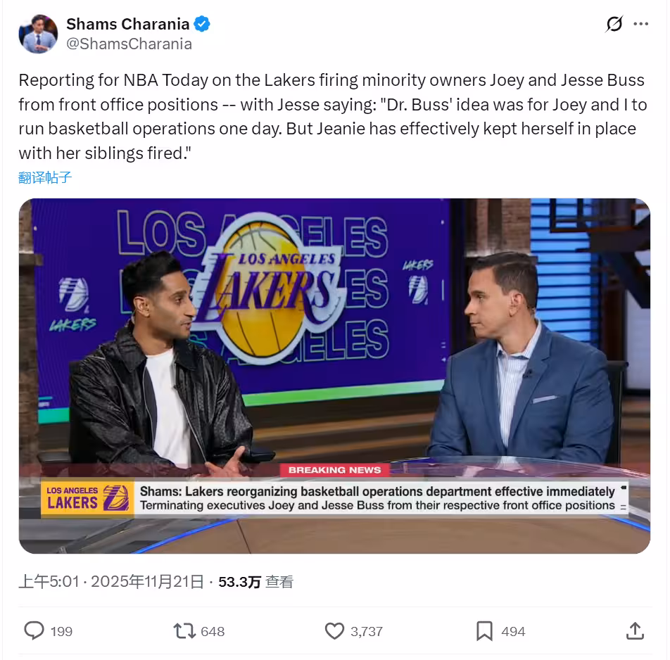 珍妮-巴斯未來幾年繼續掌管湖人,這是賣隊時跟新老闆達成的共識。喬伊-巴斯和傑西-巴斯被解僱有兩個主要原因:1、新老闆沃爾特想慢慢降低巴斯家族在湖人的影響力;2、這哥倆當初反對珍妮賣掉球隊,沃爾特是「秋後算帳」。