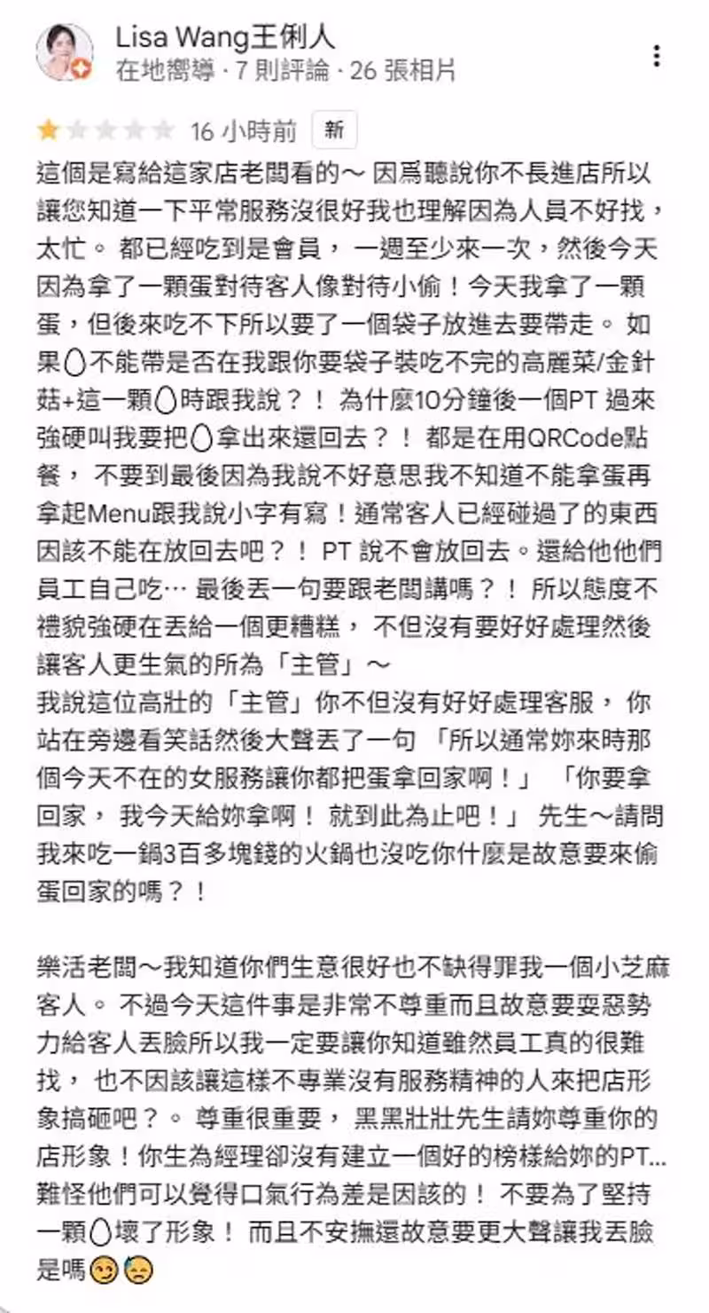爭議隨後升級,王俐人指控,主管出面時態度強硬,帶有諷刺意味地說:「所以通常你來時,那個今天不在的女服務員讓你都把蛋拿回家啊!」「你要拿回家,我今天給你拿啊!就到此為止吧!」這番話讓王俐人感到極度不受尊重,認為主管「故意要耍惡勢力給客人丟臉」,因此憤而留下負評。
