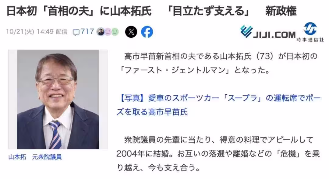 10月21日下午,高市拓的電話響個不停。面對日本各大媒體蜂擁而至的來電,他平靜地表示自己只想做一位「隱形丈夫」,做好每一頓飯,讓妻子在政壇上好好閃耀。
