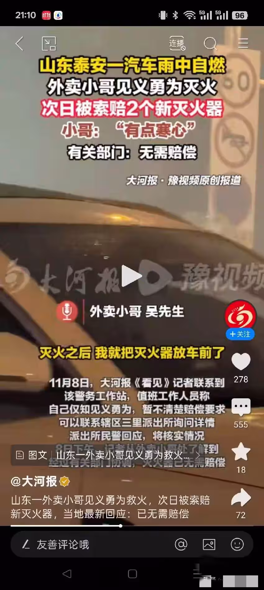 車輛自燃外送小哥「挺身救火」!!次日被索賠新滅火器...讓他寒心,警方回應