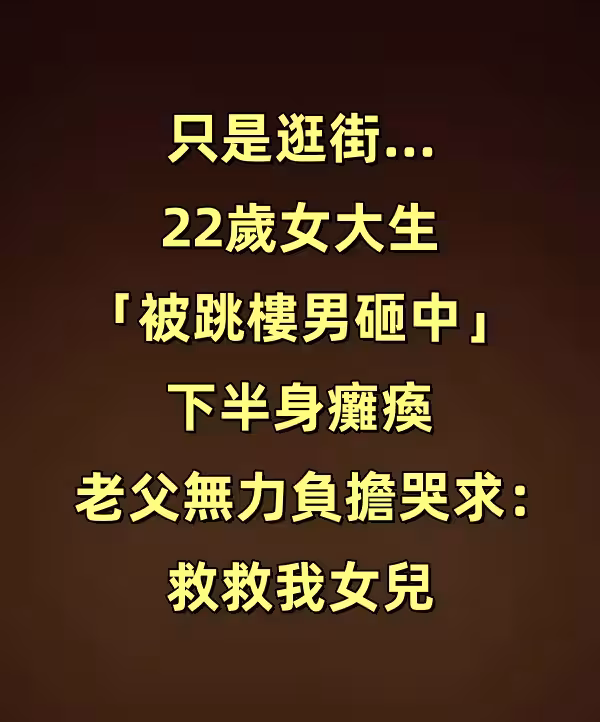 只是逛街…22歲女大生「被跳樓男砸中」下半身癱瘓 老父無力負擔醫療費哭求:救救我女兒