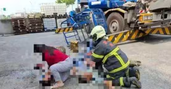 當時吊車準備要將4名工人送上去,執行高空弔掛作業,沒想到吊臂突然斷裂,在吊車上的4名工人被重摔,傷勢嚴重。