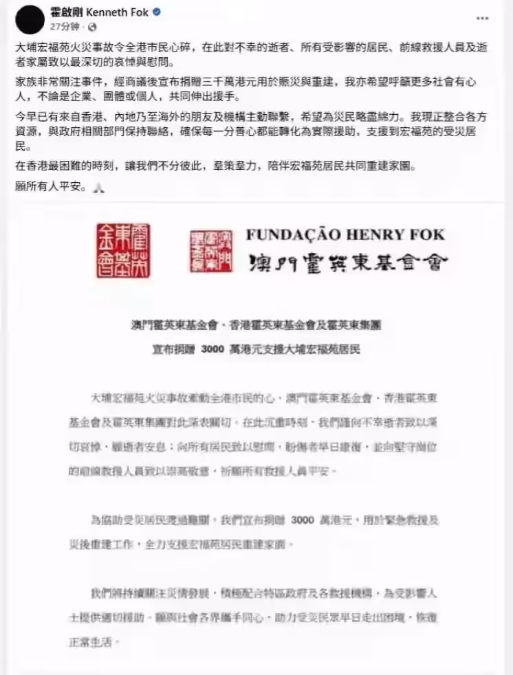 霍啟剛的這番行動不僅展現了豪門應該承擔的社會責任,也激發了不少香港的本地企業和個人積極加入到捐款行列中。