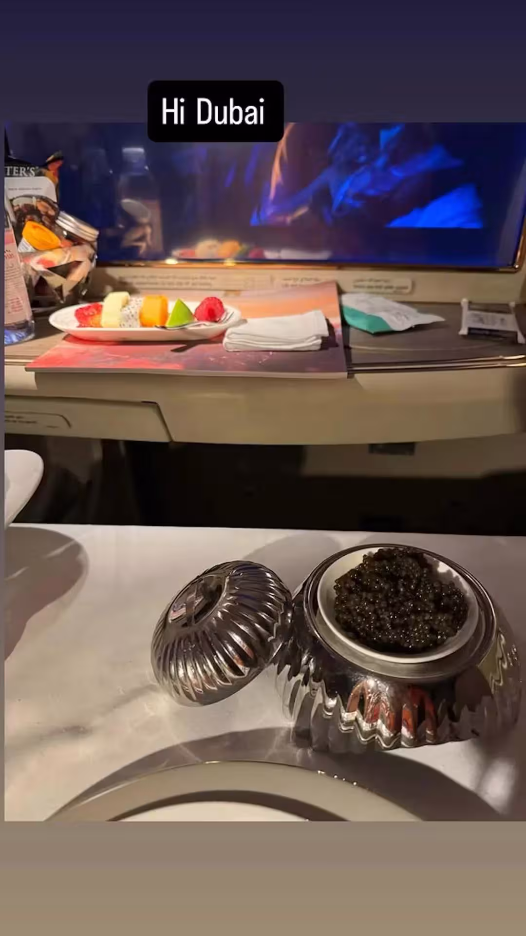李美慧在IG限時動態分享照片,並寫道:「Hi Dubai.」相中所見,她身處飛機頭等艙,一邊看電影,一邊享用果盤和魚子醬,相當享受!