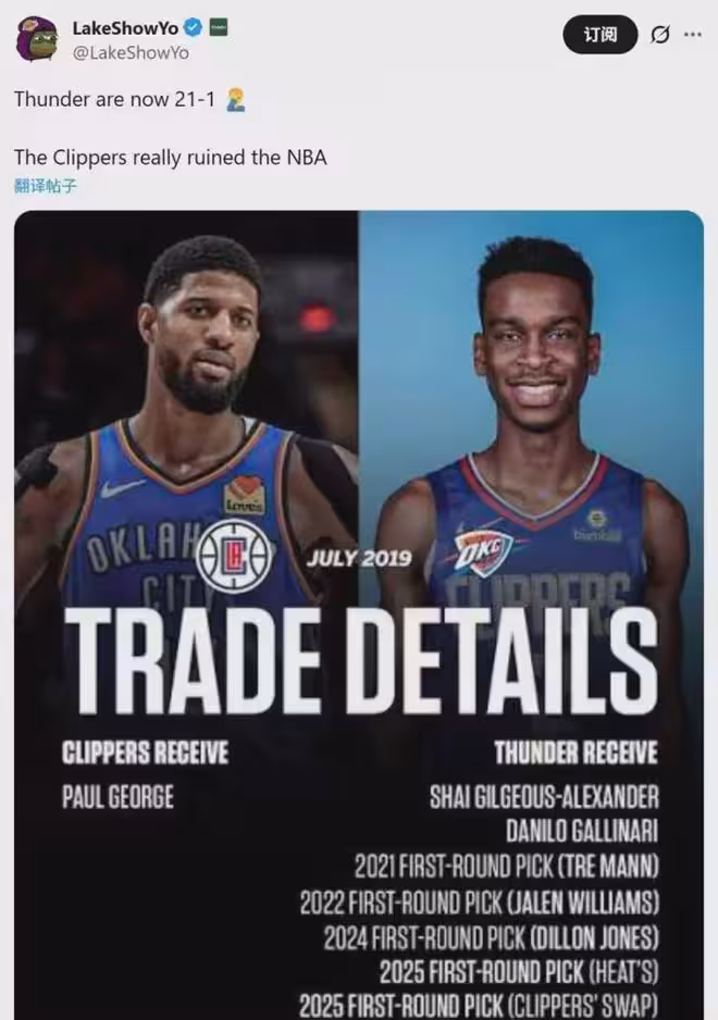 湖人自媒體LakeShowYo對此寫道:「雷霆現在21勝1負,快船毀了聯盟。」
