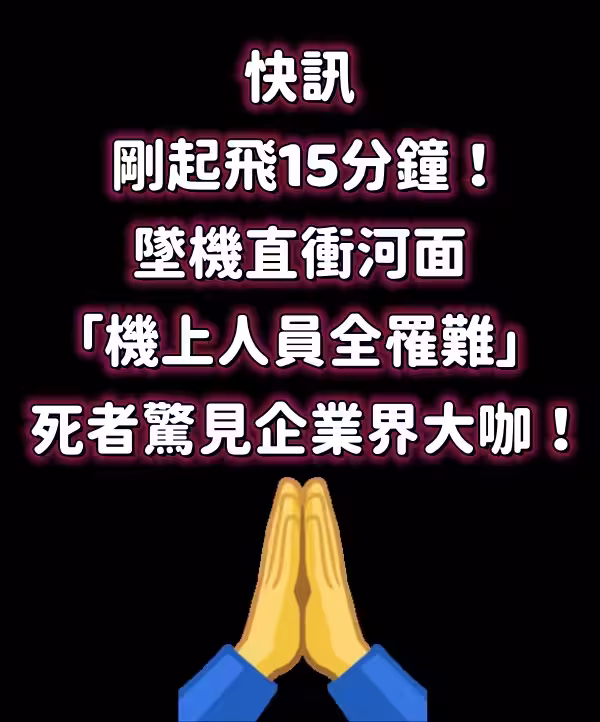 快訊/剛起飛15分鐘!墜機直衝河面「機上人員全罹難」…死者驚見企業界大咖!!!