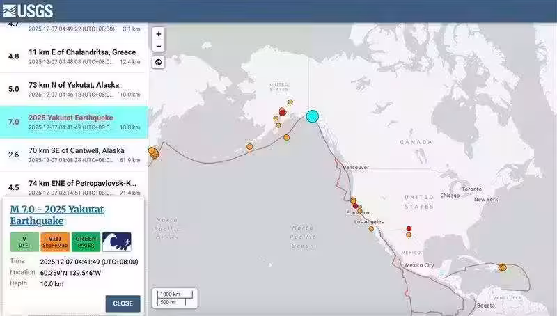 根據《三立新聞網》報導,位於美國阿拉斯加州及加拿大育空地區交界的偏遠區域,在當地時間今日突然發生芮氏規模7.0的強烈地震。