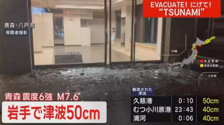 日本青森縣外海當地時間今(8)日晚間11時15分左右發生地震,規模7.6,11時33分又發生規模5.6地震,北海道、青森縣岩手縣等多地發布海嘯警報後,陸續測得海嘯襲來。東北地區至少4000戶停電,超市、住家也傳出災情。