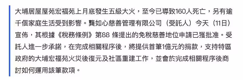 所以,為了致敬龔如心的遺願,受託人承諾積極支持火災後的復原及社區重建工作,故此從龔如心的遺產中撥款一億元支持災後重建。