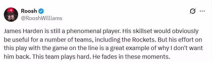火箭記者Roosh Williams也在社媒上談到此事。」詹姆斯-哈登依舊是一名極具天賦的球員。他的技術能力顯然能為多支球隊提供助力,火箭隊也不例外。但在這場比賽的生死時刻,他在那個關鍵回合里的拼勁,恰恰印證了我為什麼不希望他回歸 —— 這支火箭隊的球員個個全力以赴、奮勇拼搏,而他卻在這樣的緊要關頭總是掉鏈子。」