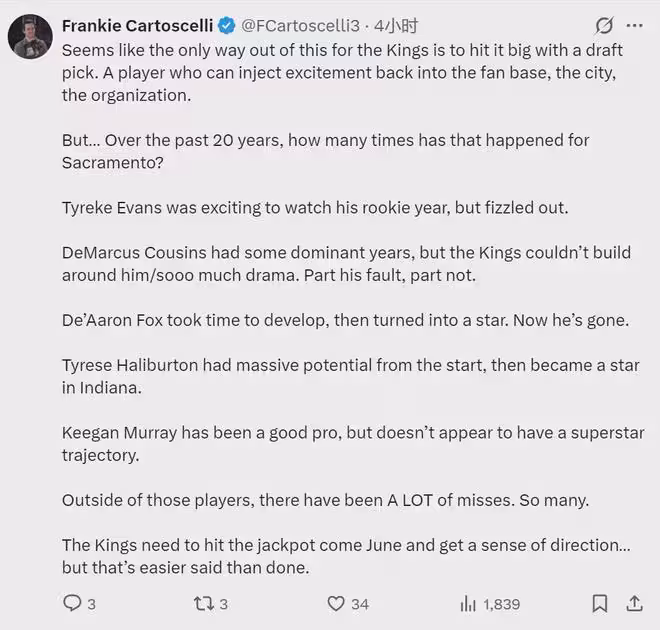 「泰瑞克-埃文斯新秀賽季出色,之後未能延續輝煌;考辛斯有過幾個統治級的賽季,但國王內部矛盾太多,沒能堅持圍繞他建隊;福克斯花了很長時間才成長為一名球星,如今他已離開;哈利伯頓展現了巨大潛力,但他被送到步行者。」