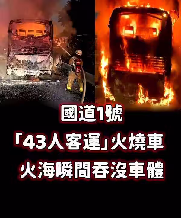 國道1號北向3公里處八堵路段,發生嚴重火燒車事故,一輛全車載滿43人的2088路線客運,不明原因火燒車,全車陷入一片火海。