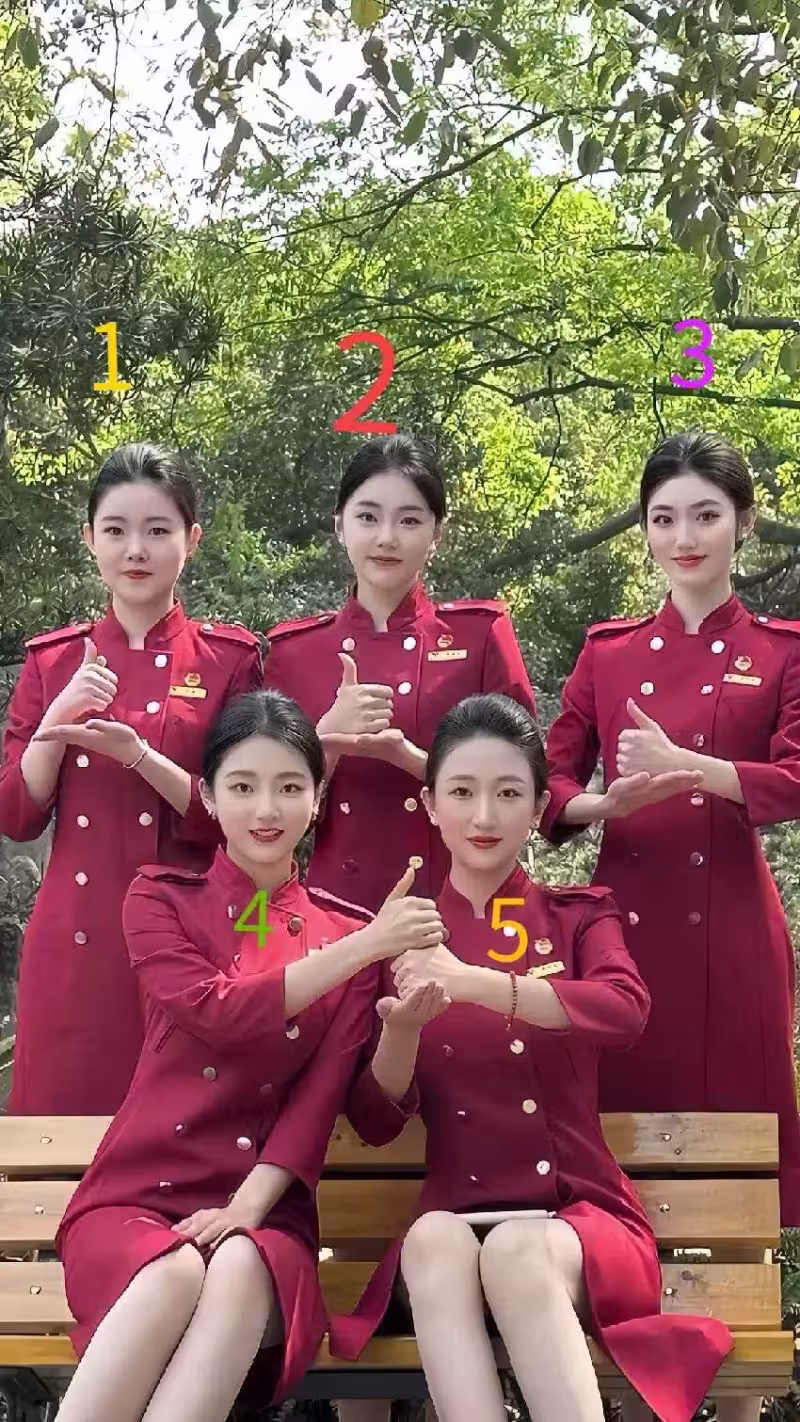 畫面中,五位身著酒紅色制服的空姐姿態優雅,在綠樹成蔭的背景下並肩而立,她們面含微笑,分別擺出不同的手勢,氣質出眾。