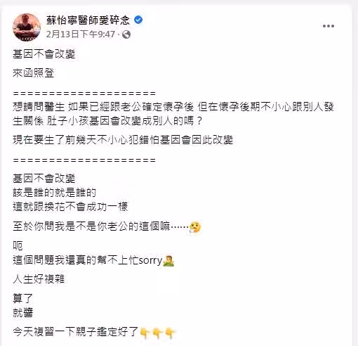 懷孕出軌!孕婦急問「小孩基因會改變成別人嗎?」