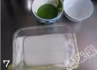 8.再稱相等量(80克/份)抹茶麵糊,倒入7中,再放入蒸鍋中,大火蒸3-4分鐘。以此類推,共倒入九層,在蒸最後一層時,蒸的時間稍長些,5-6分鐘左右,即可
