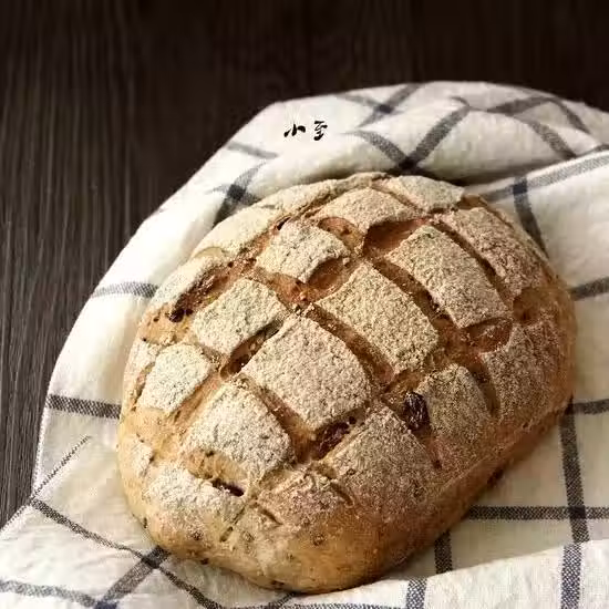 4、烘烤不需要石板,也不需要蒸汽,比較簡單的軟歐包。外皮不脆,整體麵包口感比較柔軟。糖比較少,葡萄乾較多,增加了甜味。軟歐可在硬歐和軟包之間找到平衡,擁有歐包的外表,軟包的心,比硬歐口感好,比軟包更健康;