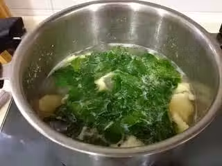 2.加入樹仔菜,煮至板面浮起,把所有板面和樹仔菜撈起.