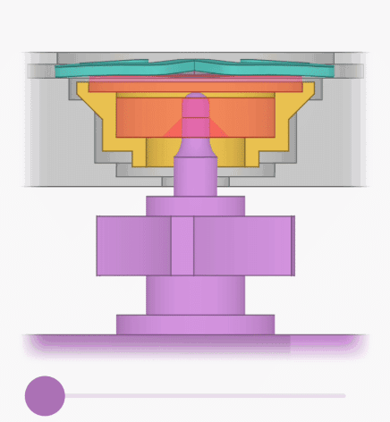 當手錶震動時,軸的震動會被彈簧吸收,類似於汽車中的懸架系統。如果震動非常強,那麼擺輪軸更粗更堅固的部分會接觸夾板承擔負載,從而保護脆弱的尖端不被折斷。現在,我們將整個擺輪組件安裝到迄今為止我們構建的機芯的其餘部分。